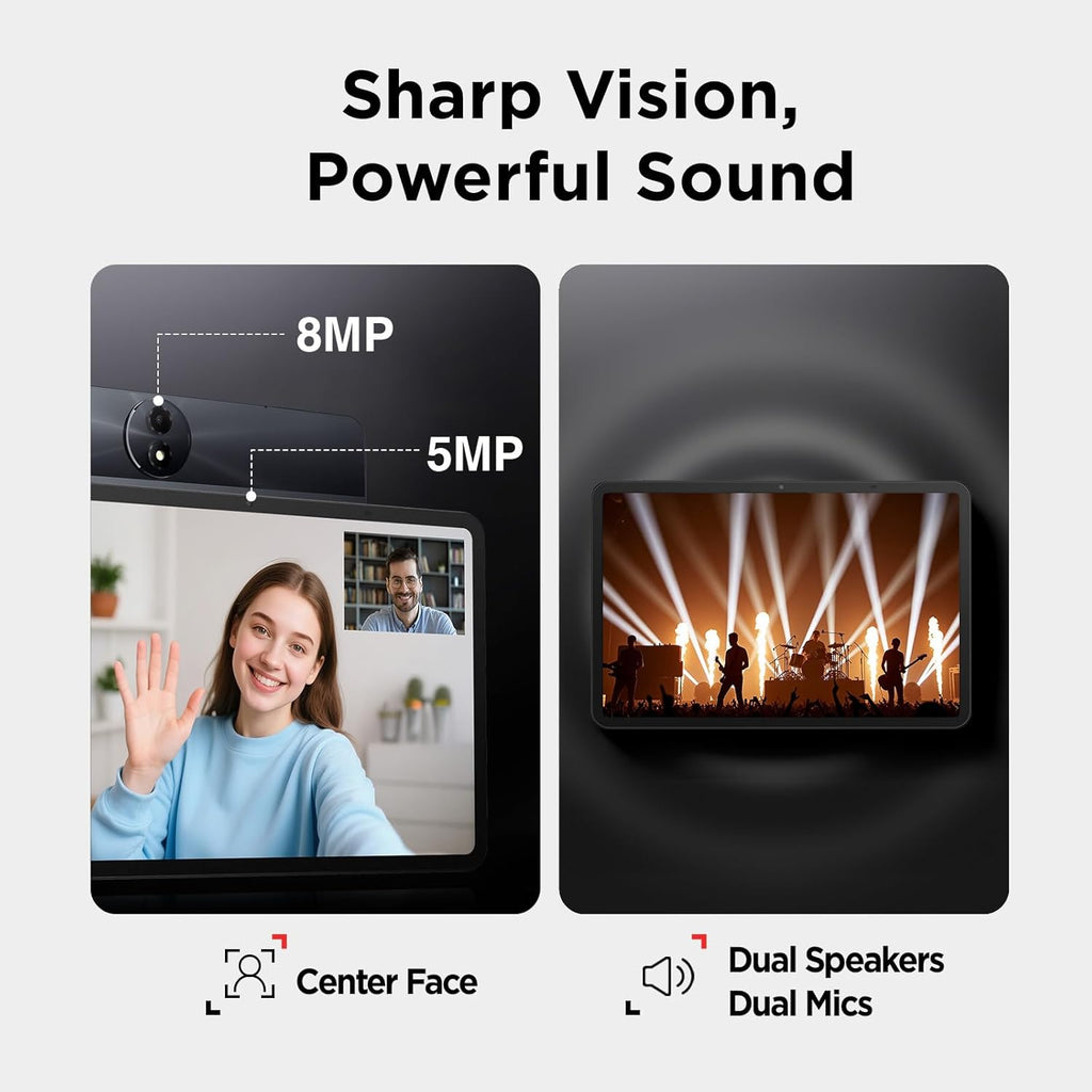 5MP front + 8MP rear camera with flash—1080P recording is sharp. Perfect for video meetings, online classes, or daily snaps. Dual speakers + mics go up to 200% volume—hear and be heard even in noisy spots. Plus CenterFace tech keeps you centered on Zoom/Google Meet!
