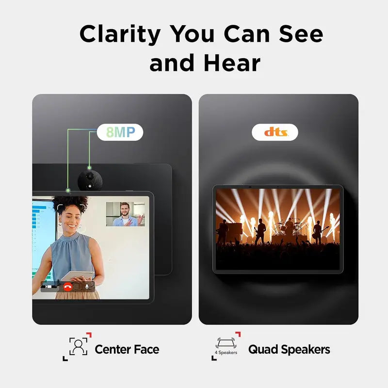 8MP front + rear cameras for HD calls/photos—CenterFace tracking keeps you in frame, even moving. Quad speakers + dual mics (with smart PA & DTS sound) deliver deep bass and crisp voice. Sound Booster cranks volume to 200%—hearing is easy, even in noise!